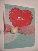 This one uses Perfect Pair stamp set, More Amore dsp, Whisper White and Pool party card stock, paper doily, Silver Embossing Powder, versamark and Heat tool, Flower Trim ribbon, 1 1/4" two-tone ribbon in Pink pirouette/rose red and Honeycomb embossing folder.